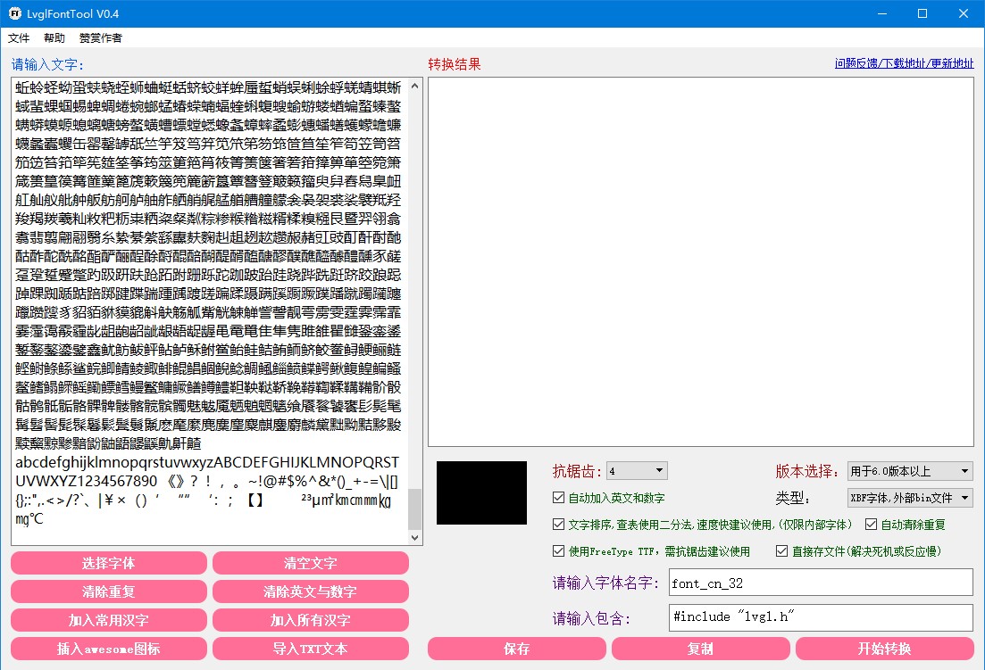 先来生成字库, 字库生成使用LvglFontTool软件, 官方下载地址, 绿色版软件, 直接解压即可使用. 感谢作者
