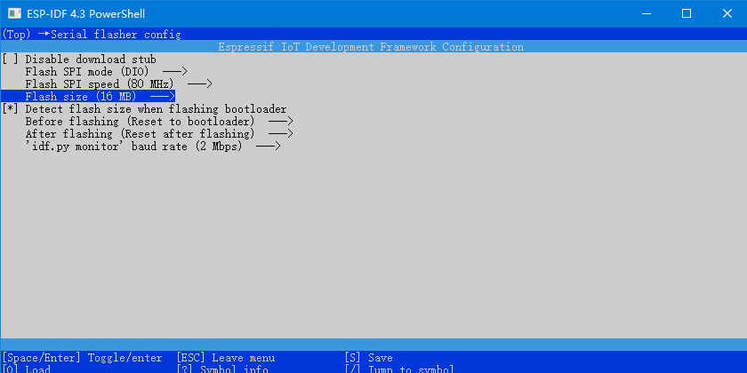 另外提一下, 我们可在menuconfig中, 设置一下flash的size大小, 一定要和自己使用的模块一致, 如下图操作: