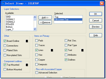 在生成丝印层时最好先预览一下,查看是否有丝印遗漏的情况(在做iMX233板的时候曾因为丝印的线宽不一致导致部分丝印未能显示,解决办法是在top层中勾选outlines项)。