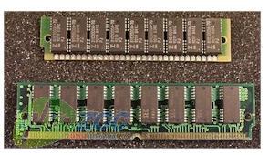 这两款内存的容量均为4MB,位宽为32bit,当然也属于DRAM了。TM124BBJ32F内存为单面而TM248CBJ32F双面的两种模式,不过其中单面TM124BBJ32F有些奇怪,在它的内存条上只有两颗内存芯片,这样每颗内存芯片应该是2MBx16bit。另外,双面的TM248CBJ32F由4片1Mx8bit DRAM芯片组成。