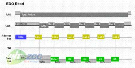 在介绍FPM的读取过程的最后我着重提到了 FPM DRAM是在上一次的数据读取完毕才会进行下一个数据的读取,但是对于EDO DRAM却是完全不一样的。EDO DRAM可以在输出数据的同时进行下一个列地址选通,我们依然结合下面的EDO读取时序图来了解EDO DRAM读取数据的过程: