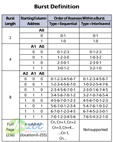 突发类型主要分为两种:sequential和interleaved——主要由M3所决定。访问顺序主要由突发长度、突发类型和起始列地址所决定,如下表: