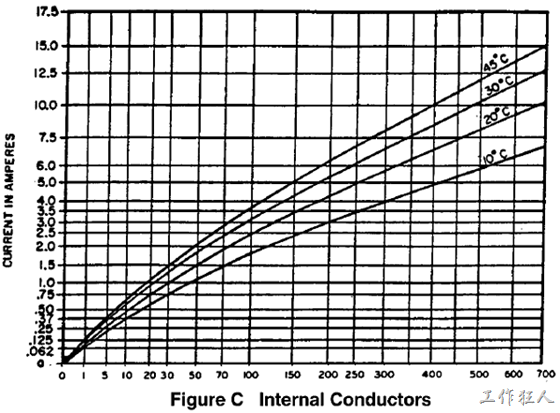 ▲IPC-2111图表6.4, Internal Conductors铜箔截面积、温度与最大载流能力的关系。