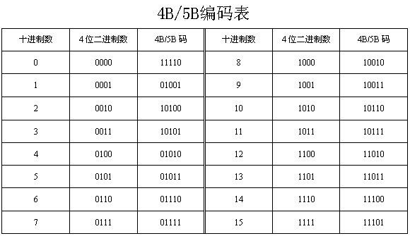 4B/5B编码是百兆以太网中线路层编码类型之一,就是用5bit的二进制数来表示4bit二进制数,映射方式如下表所示: