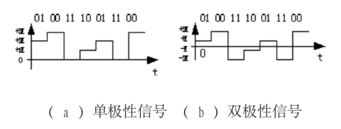而图( b )为双极性信号,具有正负电平,分别用 +3E 、 +E 、 - E 、 - 3E 对应两个二进制符号(一位四进制) 00 、 01 、 10 、 11 。