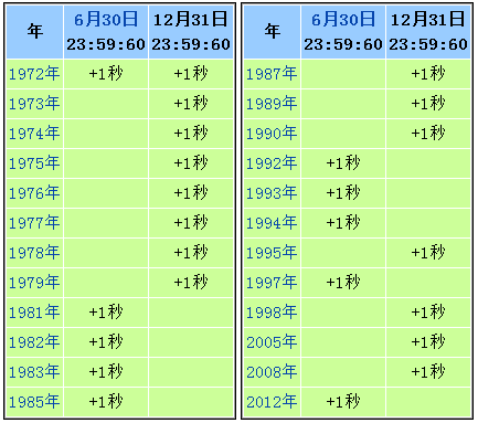 从上表中我们可以看到,从1972年到现在,在这四十年里已经进行过25次的闰秒调整。闰秒是在每年6月或12月的最后一天的最后一分钟进行跳秒或不跳秒。是否加入闰秒由位于巴黎的国际地球自转和参考坐标系统服务(IERS – International Earth Rotation and Reference Systems Service)决定。如果决定加入闰秒,那么这一秒是被加在第二天的00:00:00前的,也就是说,时间会出现23:59:60的情况,然后才是第二天的00:00:00。如果是负闰秒的话,23:59:58的下一秒就直接跳到第二天的00:00:00了。现在,所有闰秒都是正闰秒。