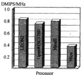 图5给出了几种处理器的性能对比图。显然三种32位处理器的性能比指令集为16位的准32位Nios处理器高出很多。在三种32位处理器中,LEON2的性能最好为0.82,但其相应的所耗的资源也最多。和LEON2相比,OpenRISC1200的性能稍差为0.75,但其所占用的逻辑单元也较少。Nios处理器的测试性能可达0.80,而且其所消耗的逻辑单元仅为LEON2的57%。这是由于Nios针对Cyclone器件进行过专门的优化,导致了Nios在Cyclone器件上的出色表现。为了使比较更加全面和深入,我们还对评测系统进行了ASIC平台上的对比。由于NiosII并不提供源代码,仅针对Altera的FPGA器件是免费的,因此我们仅对比了LEON2和OpenRISC1200两种完全开放性内核。我们使用中芯国际(SMIC)的RapidCompiler完成Registerfile中所需的双口SRAM和Cache模块所需的单口SRAM的设计,并使用Synopsys公司DesignCompiler和SMIC的0.18Lm的标准单元库完成了两种内核RTL代码的综合和优化。相当占用了152904个门单元,最差条件下的最高频率为160MHz。OpenRISC1200共使用了148455个门单元,最差条件下的最高频率为125MHz。显然LEON2的运行频率更高,但其所占的面积也相对更大。