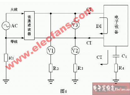 传导干扰一般是通过电压或电流的形式在电路中进行传播的,下图是测试电子设备产生传导干扰的基本方法,或表示传导干扰通过电源线传输的几种方式。下图中,电子设备表示干扰信号源,CI 表示共模干扰信号,DI 表示差模干扰信号;V1、V2、V3 分别表示用仪表对干扰信号进行测量的连接方法,低通滤波器是为了便于对V1、V2、V3 进行测试,而另外加接进去的;R1、R2、R3、R4 分别为各电子设备的接地电阻,也包括大地之间的电阻,接地电阻一般为几欧姆到几十欧姆,其阻值与地线的安装和地表面土壤结构有关;C1 为电子设备对大地的电容,其容量与电子设备的体积还有地面距离有关,一般为几微微法到几千微微法。