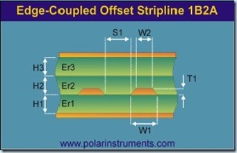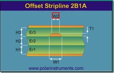 带状线是置于两个参考平面之间的带状导线,如下图所示,H1和H2代表的电介质的介电常数可以不同。