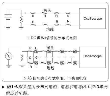 对于AC信号来说, 探头就要复杂很多, 这里还要考虑到分布电容和分布电感. (见图).