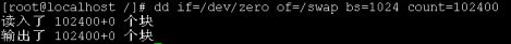 free命令也可以查看有没有交换分区的存在,如果检查没有swap,下面就需要增加,判定新交换文件的大小,将大小乘以1024来判定块的大小。例如,大小为100MB的交换文件的块大小为102400, 在 shell 提示下以根用户身份键入以下命令,其中的 count 等于想要的块大小,也就是要增加100M的交换分区。