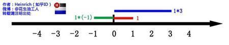 这里有一条数轴,在数轴上有一个红色的线段,它的长度是1。当它乘以3的时候,它的长度发生了变化,变成了蓝色的线段,而当它乘以-1的时候,就变成了绿色的线段,或者说线段在数轴上围绕原点旋转了180度。