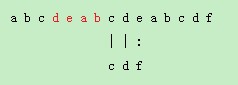 当第一次失配后,并不从红色标记字符'd'开始检测,而是通过一些有用信息,直接跳过后几个肯定不可能匹配的冗余字符,而直接让模式串Pattern从目标串的红色标记字符'c'开始新一轮的检测,从而达到了减少循环次数的效果