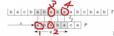 通过对各种模式串进行上述分析(大家可以自己多写几个模式串出来自己分析理解),发现给定一个匹配字符数 q ,则唯一对应一个有效位移,如上述q=5,则对应位移为2.